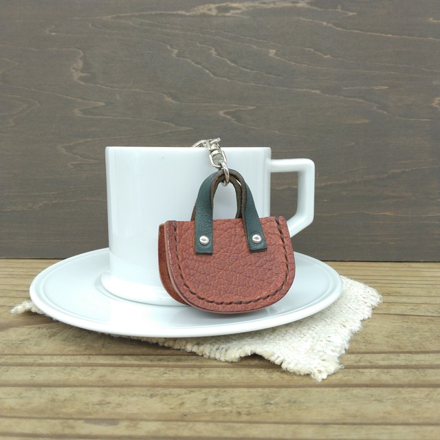 ●商品説明 ミニチュア鞄のバッグチャーム・キーホルダーです。定番物です。 一針一針丁寧に手縫いで縫って作っています。 明るい緑茶の革にレッドステッチが映えています。 鞄にぶら下げたり、鍵につけたり、プチギフトでも喜ばれます。 持ち手と金具がショルダーバッグの様で、本物の鞄ようにホックで開け閉めが出来きます。中に小銭(500円玉5,6枚)や薬やリングやピアス等をちょっとだけ入れられます。 ●サイズ たて35㎜×よこ45㎜×まち20㎜ ●購入の際の注意点 ハンドメイド商品のため、仕上がりに多少の個体差が生じます。革の仕入れロットによって色味が多少濃い薄いといった場合があります。画像の写り具合やお使いのブラウザによって少し色味が違って見える場合がございます。ご了承くださいませ。発送は簡易包装をしてゆうパケット便で発送になります。厚さを抑えるためかぶせを開いた状態での発送になります。