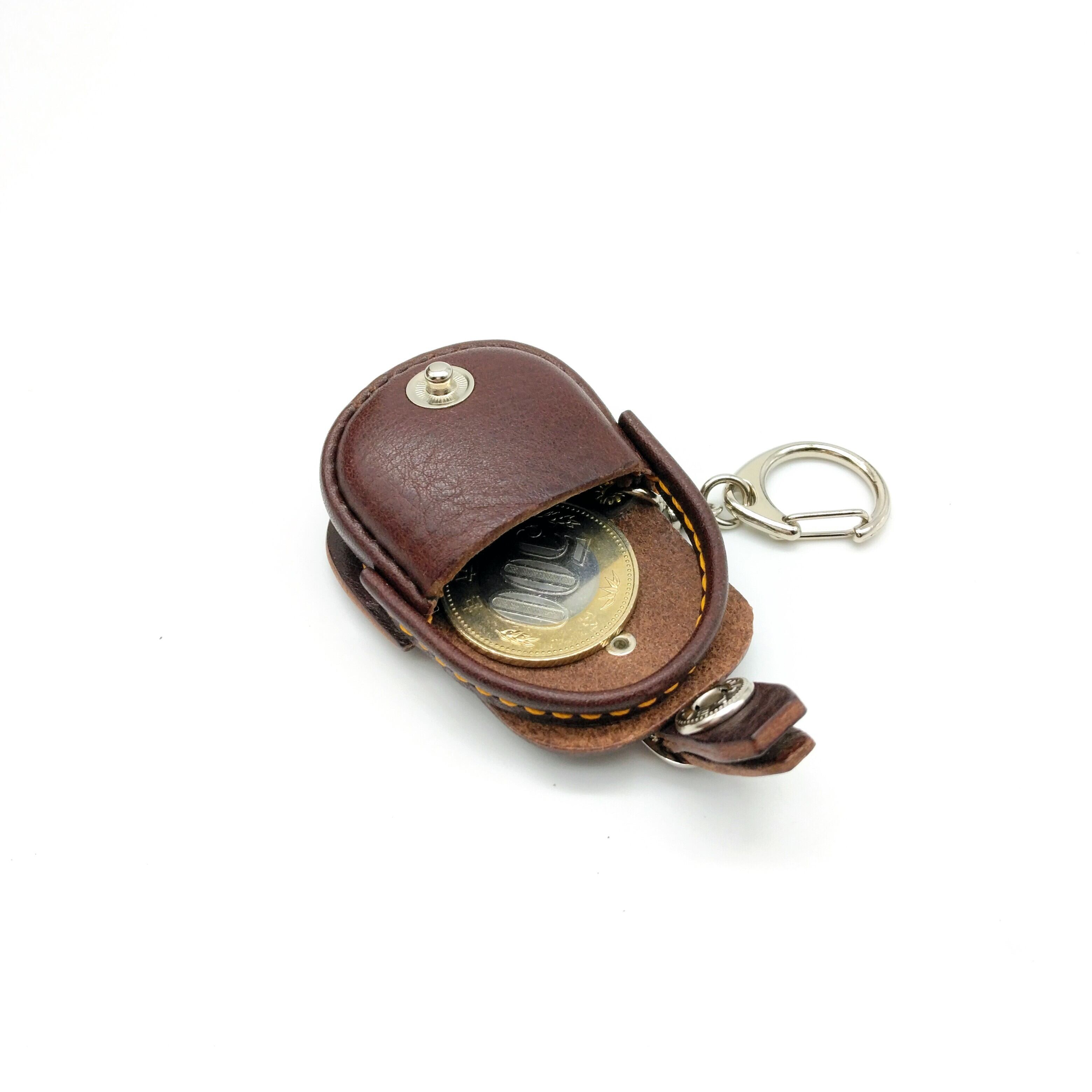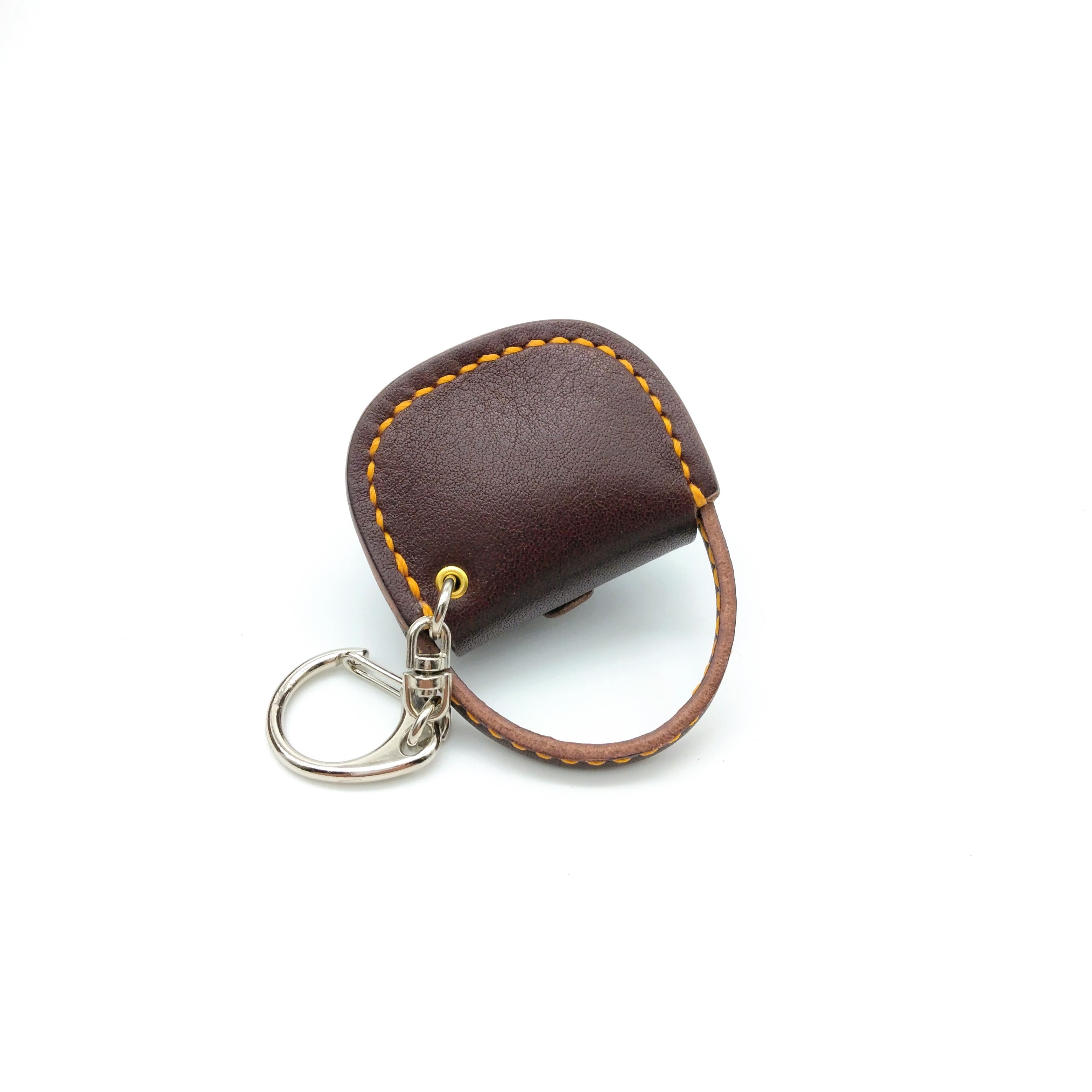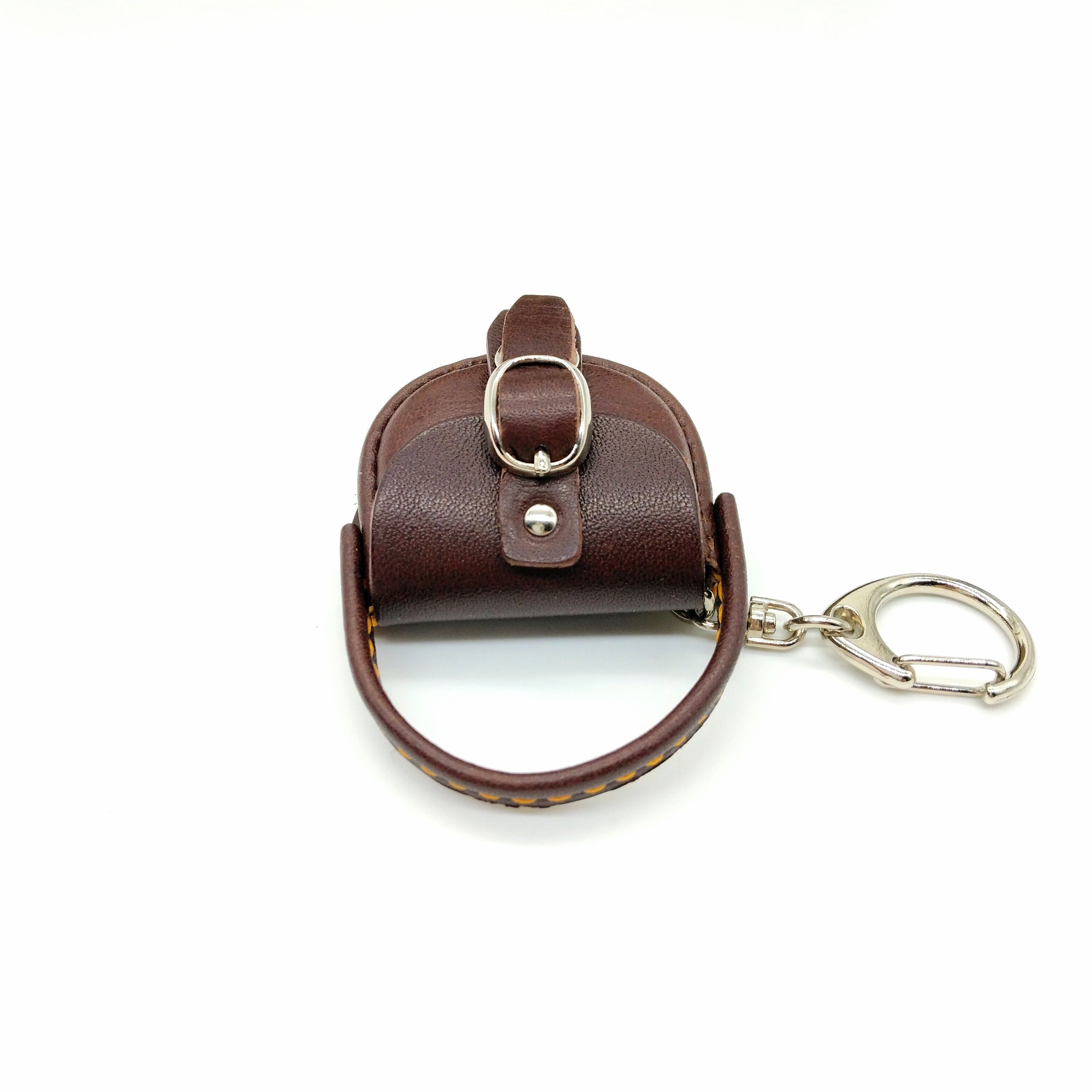 こげ茶の革にイエローステッチが映えています。