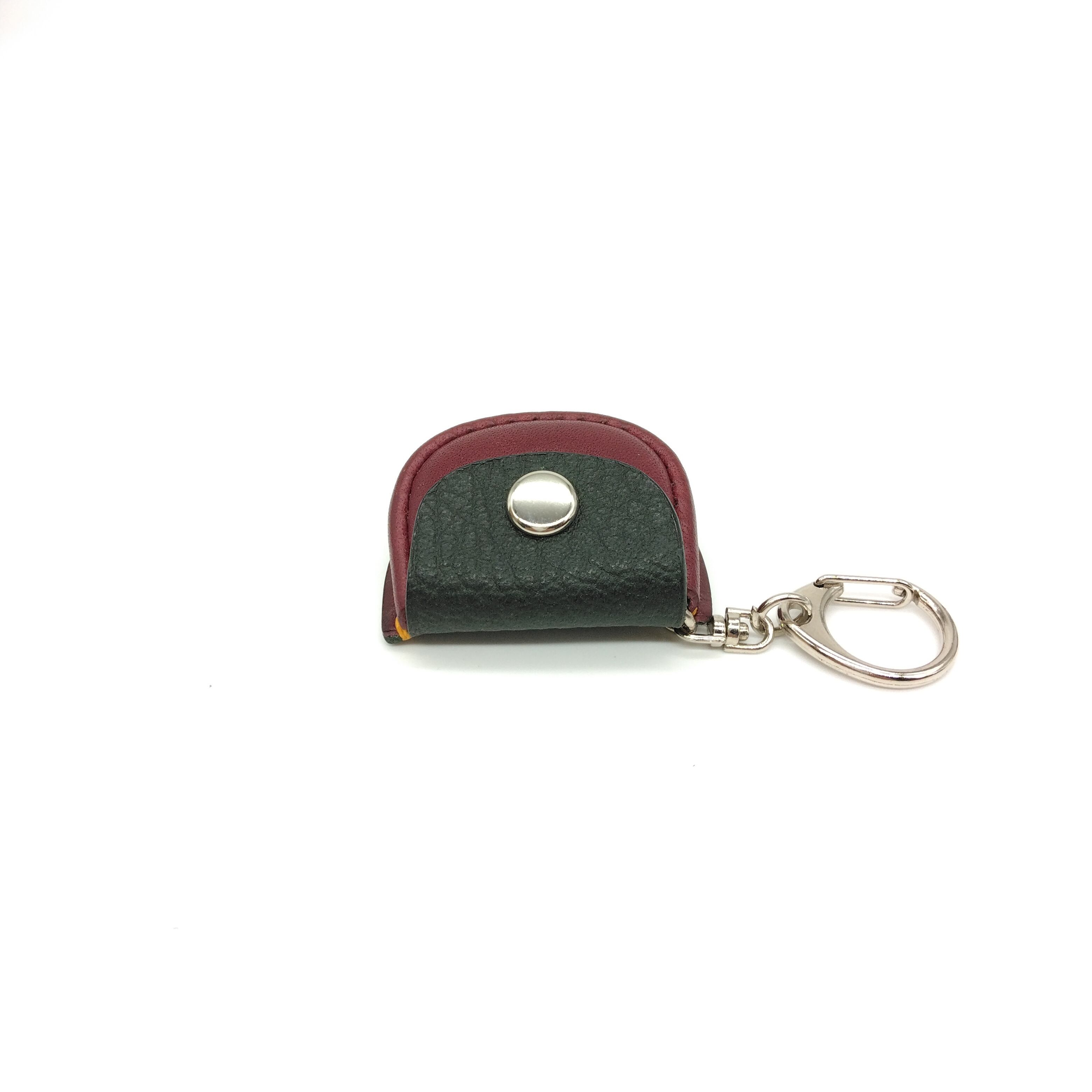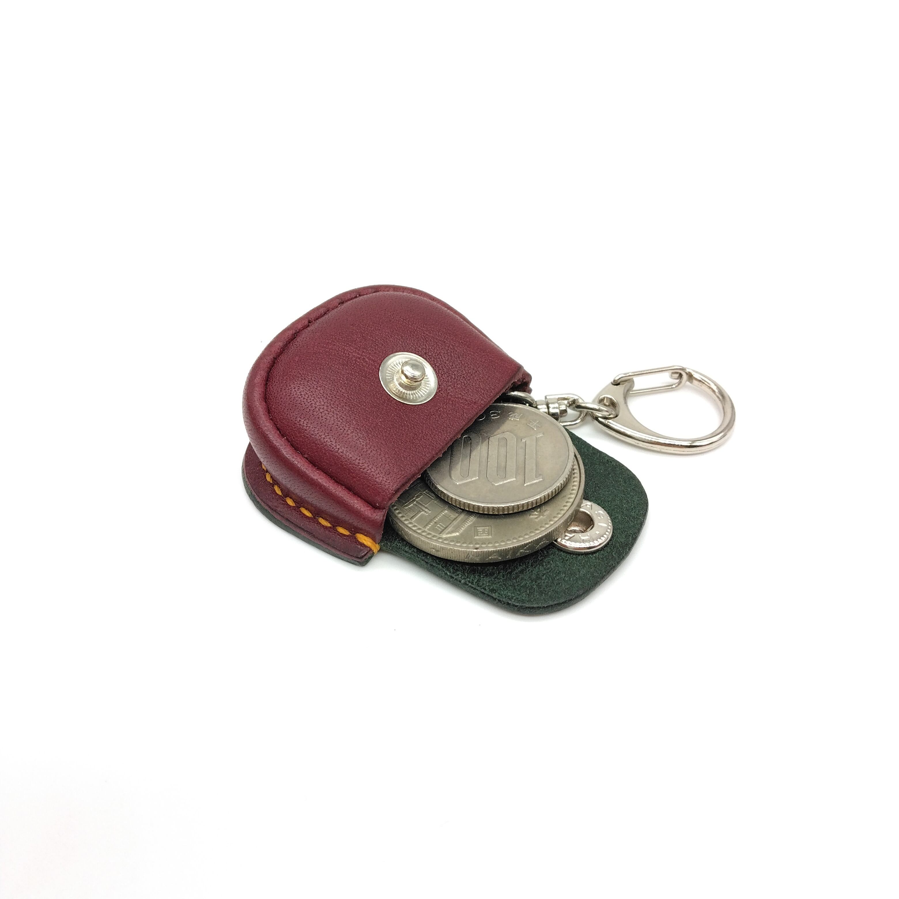 濃緑のシボ革とワイン色の革を組み合わせてイエローステッチがアクセントになっています。