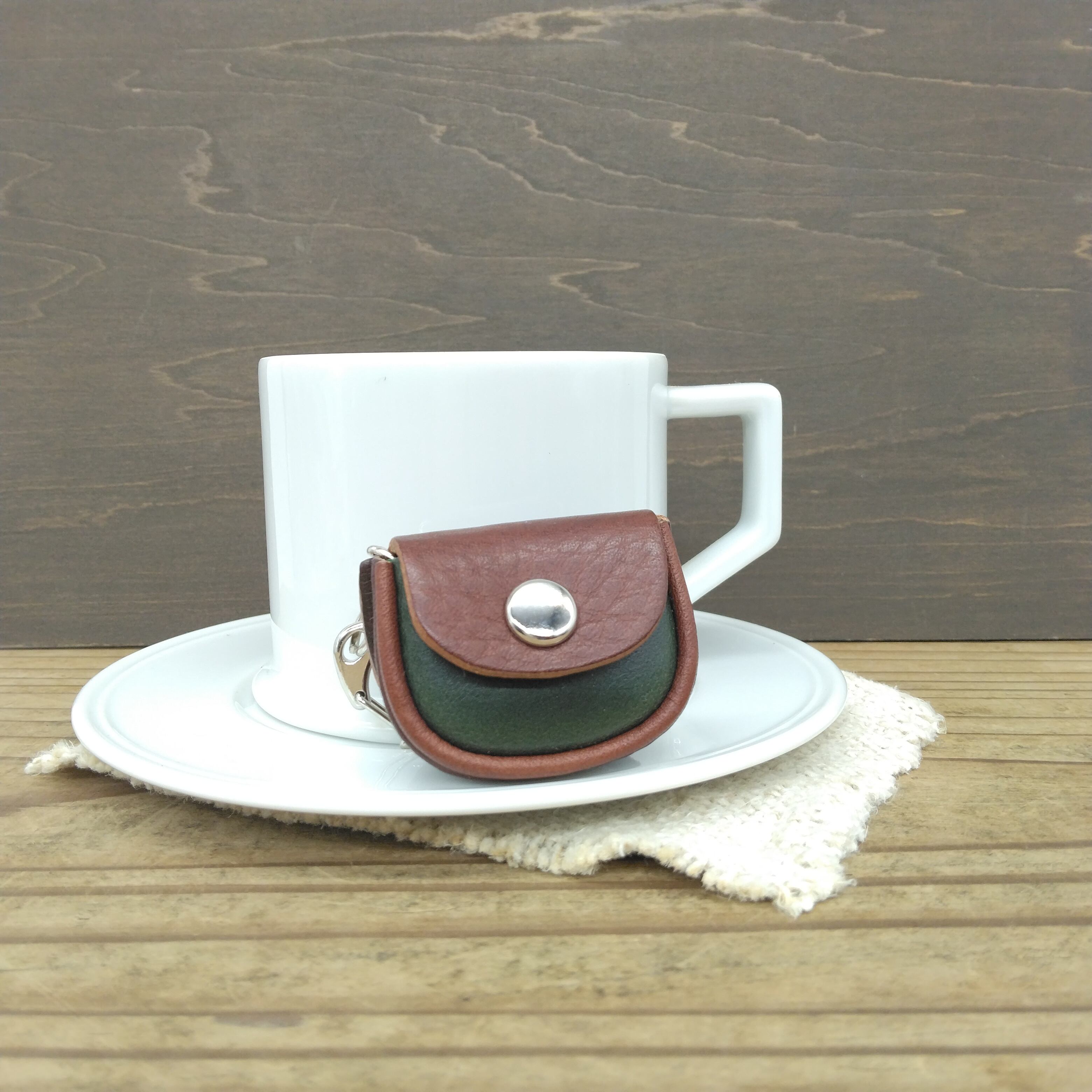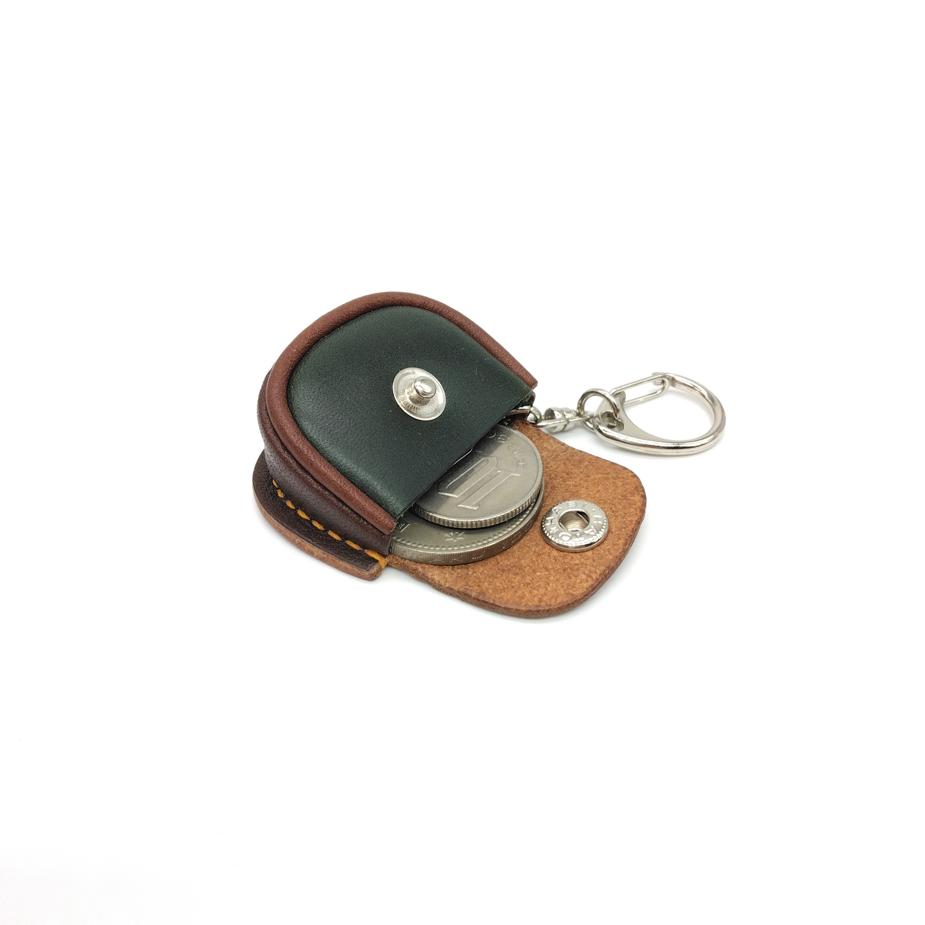茶系の革2種類と緑の革を合わせてイエローステッチがアクセントになっています。