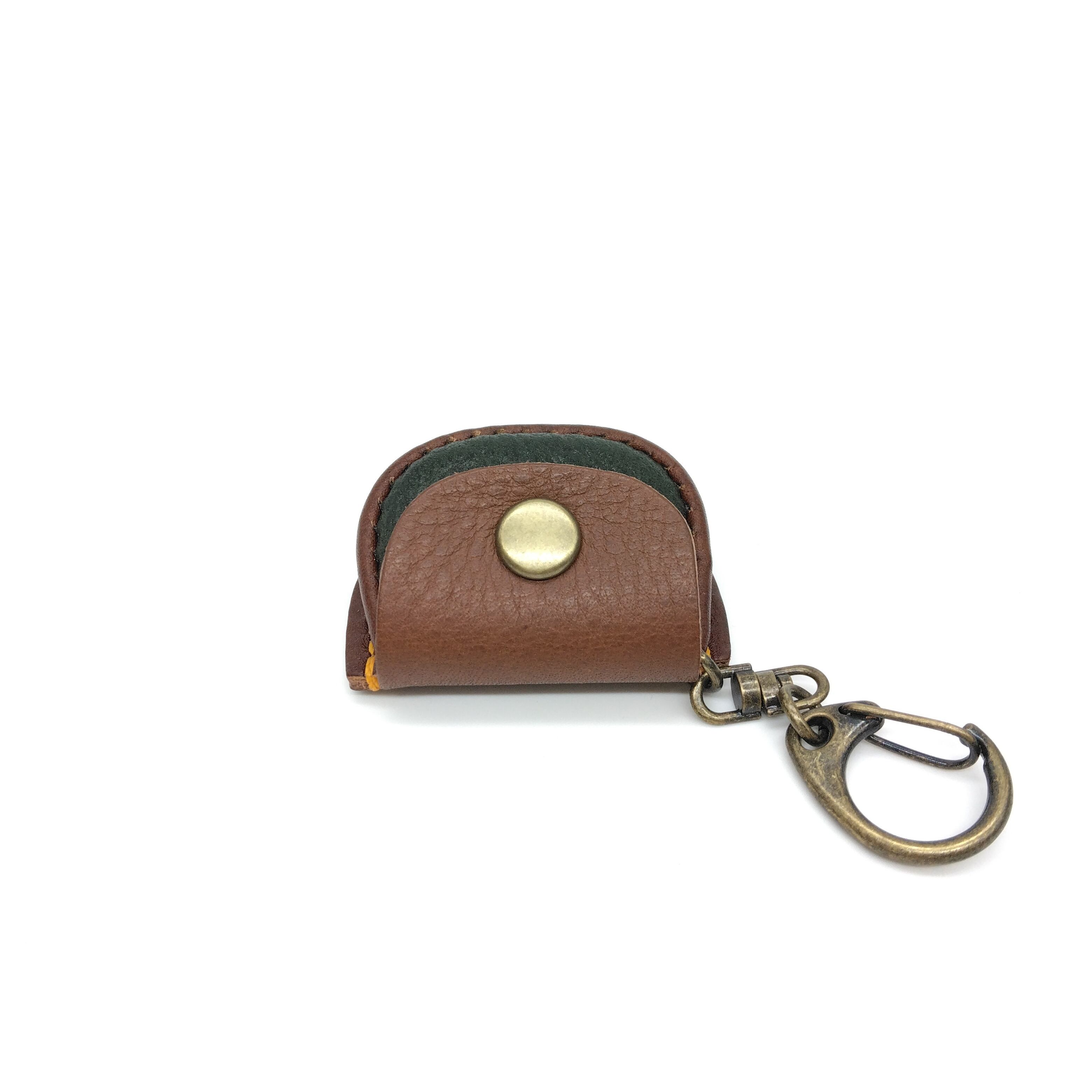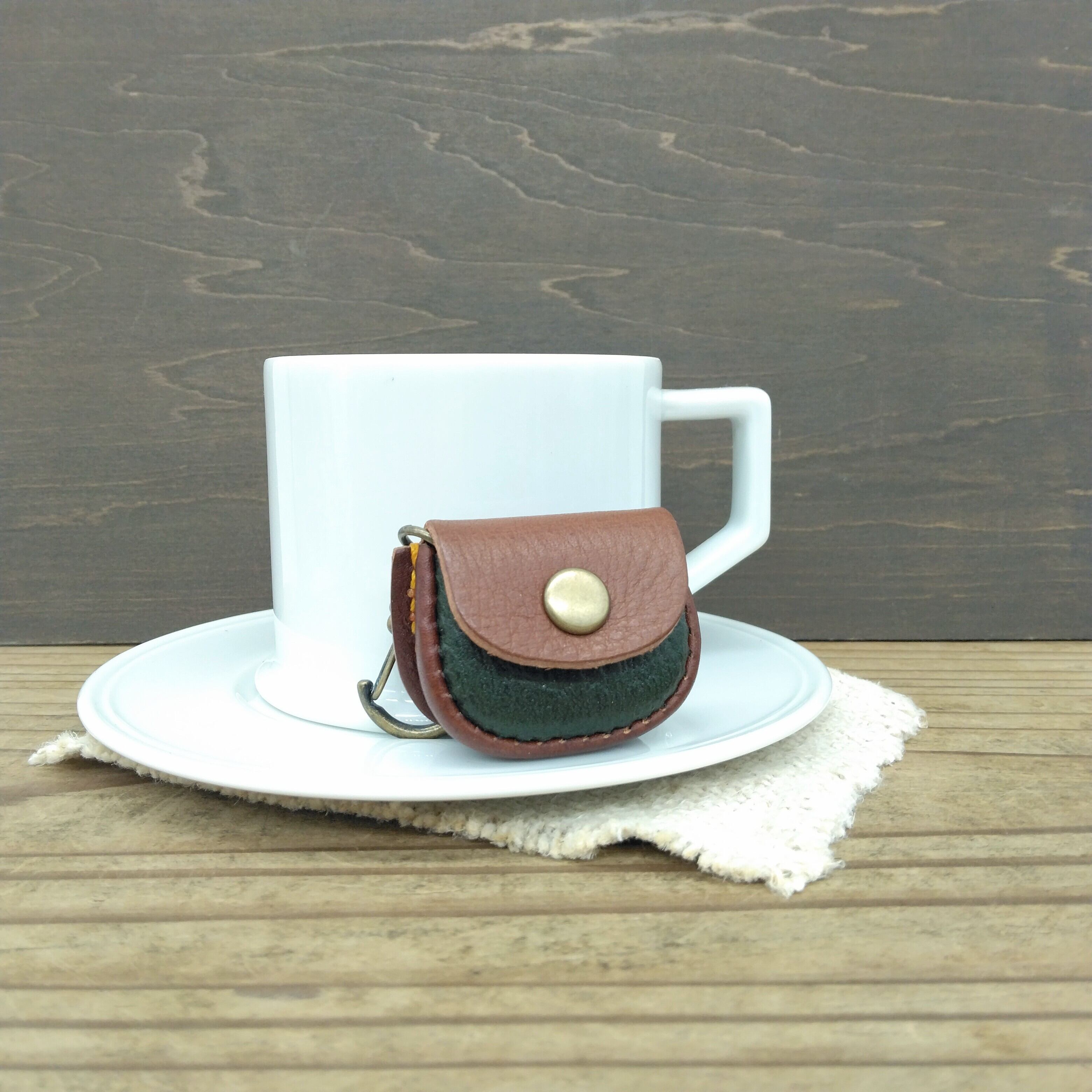 茶系の革2種類と緑色の革を組み合わせてイエローステッチで明るくしました。
