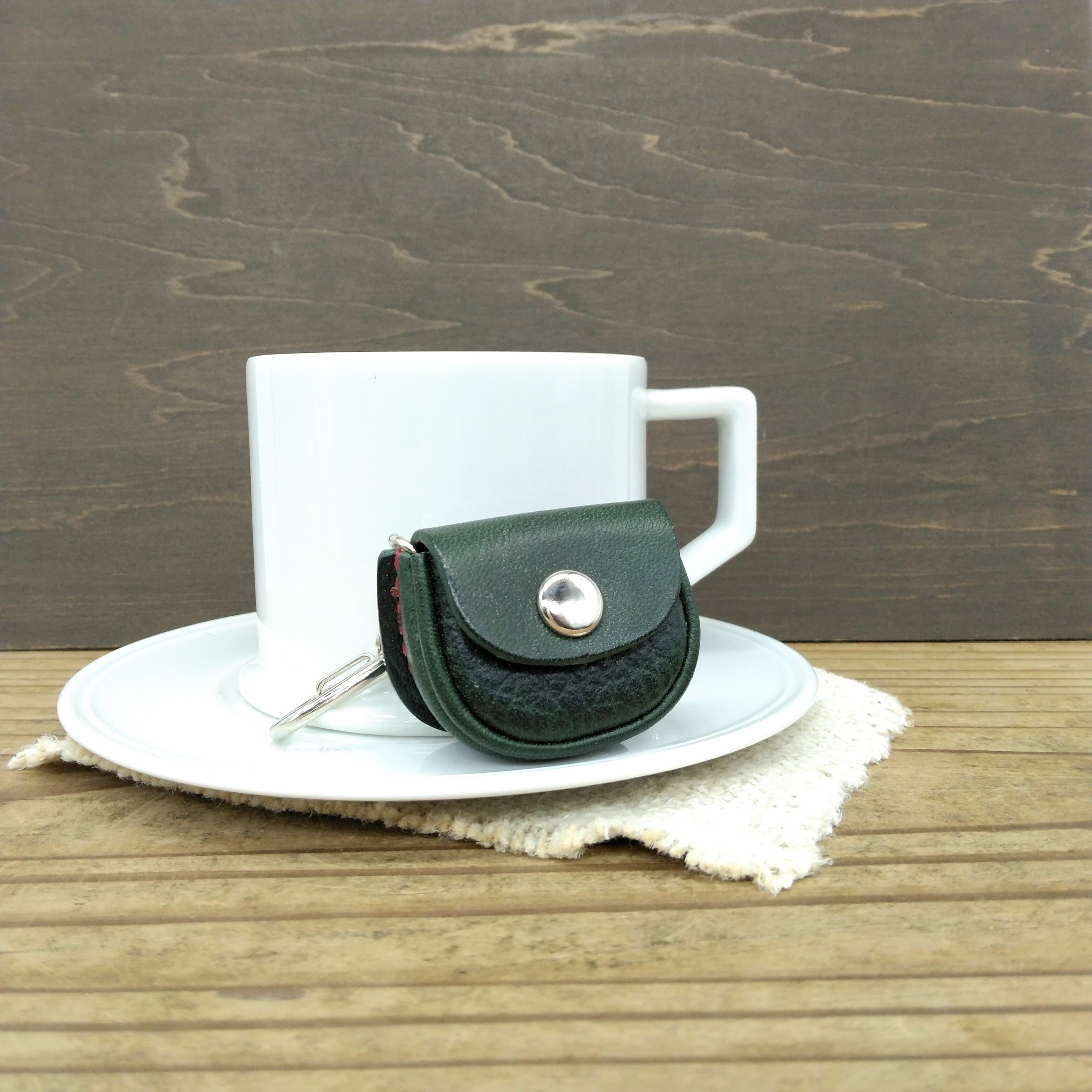 濃い緑色の革を2種類組み合わせてにレッドステッチが映えています。